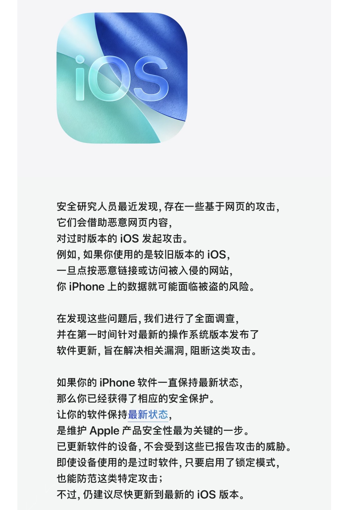 4月15日,苹果官方微信发文建议更新iOS以保护iPhone免受网页攻击。